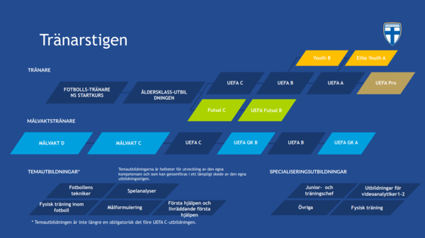 Nedan en bild av hur Bollförbundets utbildningsstege ser ut. Startkursen är grunden och således den första kursen, varefter Åldersklassutbildning) är följande, innan man kan gå UEFA C. Temautbildningarna är korta kurser som fördjupar sig i ett specifikt ämne. (Klicka på bilden för att få upp en förstoring)